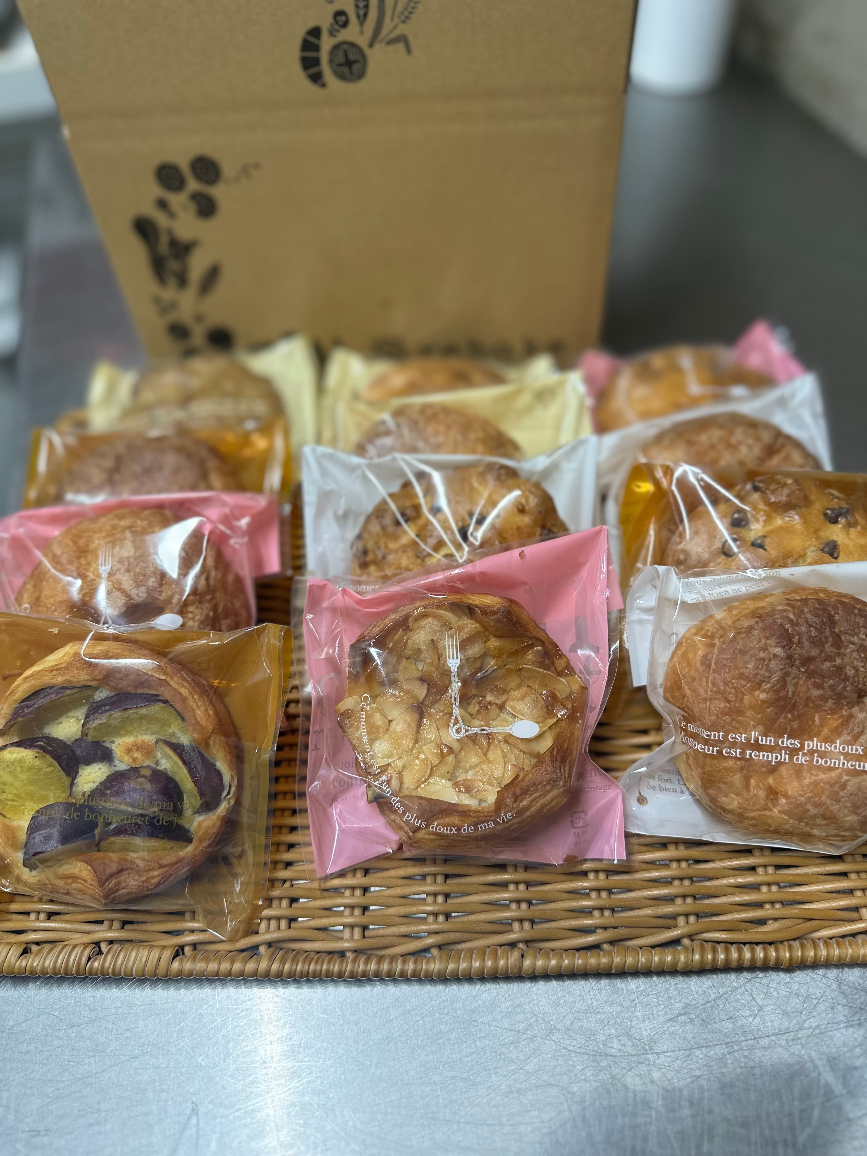 粒あん、りんご、ブルーベリー、クリームチーズ(2個)のクロワッサンと さつまいも、はちみつローストアーモンドのタルトと チョコチップ、キャラメルチョコチップ、くるみチョコチップ、黒胡麻くるみ、クランベリーホワイトチョコチップのスコーン 計12個